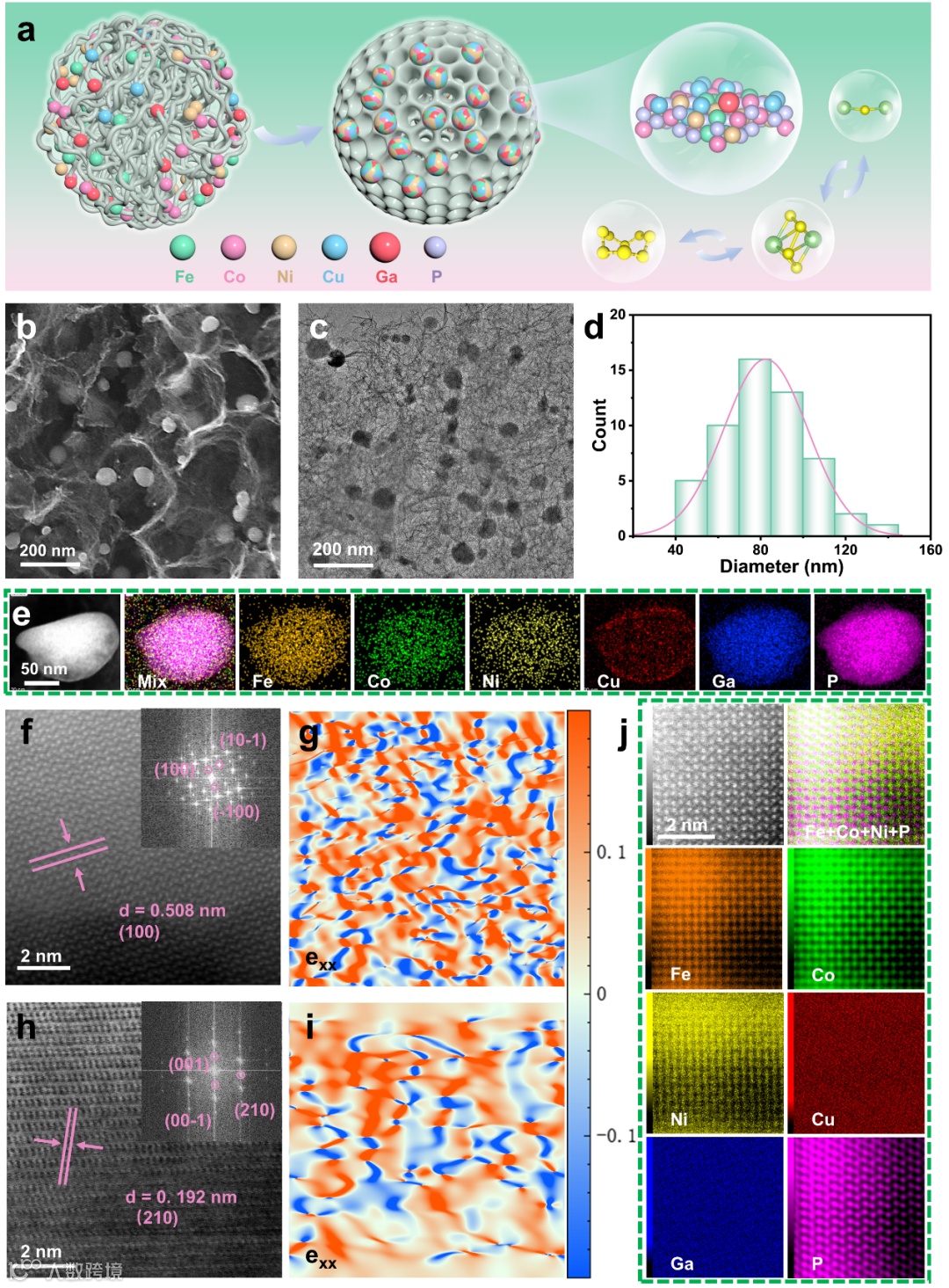 Figure 1. a) Schematic illustration of the synthesis mechanism of Ga-HEP/PC. b) SEM image, c) TEM image and d) particle size distribution of Ga-HEP/PC. e) EDS elemental mapping of Ga-HEP. f, h) ADF–STEM images of Ga-HEP (insets show the corresponding FFT images) and g, i) the corresponding atomic stress-strain distributions. j) Atomic-level elemental mapping of Ga-HEP.