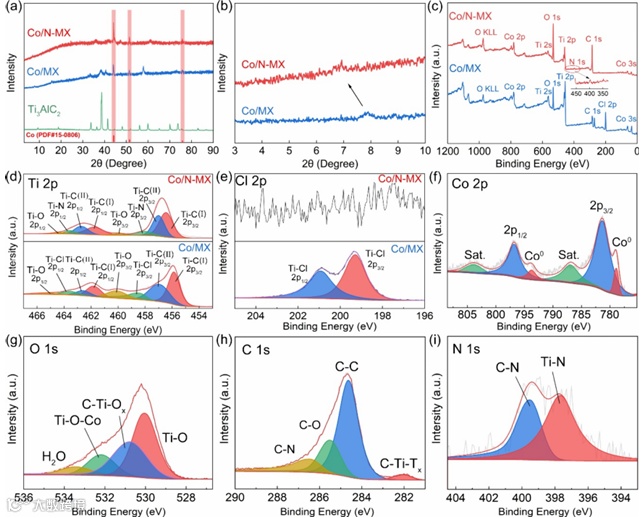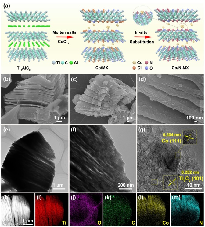本研究摒弃了传统危险的HF酸或含氟盐刻蚀方法,开发了一种通用的路易斯酸熔盐刻蚀技术。在高温熔盐环境中,利用Co2+、Fe2+、Ni2+、Cu2+等金属离子作为路易斯酸,选择性地刻蚀掉Ti3AlC2 MAX相中的Al层。该过程巧妙地利用熔盐中的其它组分作为氮源,在形成层状MXene结构的同时,实现了氮原子掺杂以及金属纳米颗粒(Co, Fe, Ni, Cu)在MXene表面的原位生长。这种合成策略不仅环境友好,而且制备出的Co/N-MX保持了良好的层状导电网络,还提供了丰富的空间和活性位点。