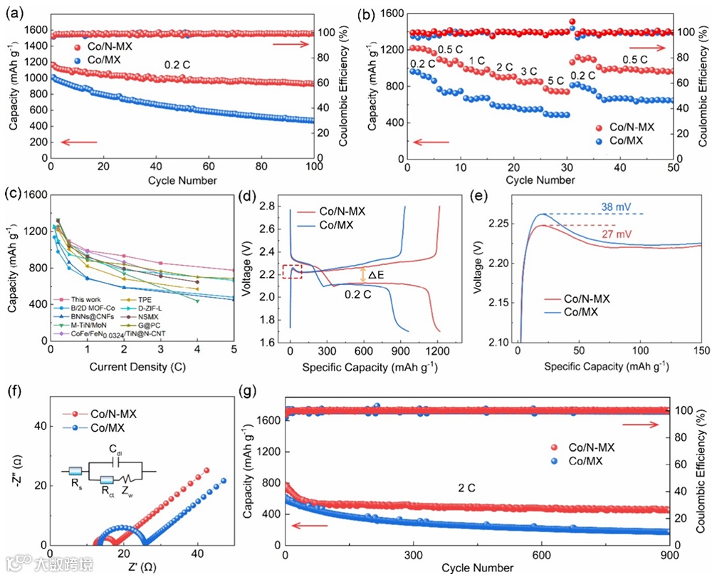 电化学测试表明,基于Co/N-MX的隔膜材料在倍率性能和长循环稳定性方面表现尤为突出,证明了该设计策略在提升锂硫电池性能方面的有效性。