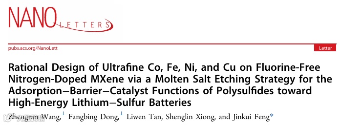 近日,来自山东大学的冯金奎教授团队在国际知名期刊Nano Letters上发表了题为“Rational Design of Ultrafine Co, Fe, Ni, and Cu on Fluorine-Free Nitrogen-Doped MXene via a Molten Salt Etching Strategy for the Adsorption–Barrier–Catalyst Functions of Polysulfides toward High-Energy Lithium–Sulfur Batteries”的研究文章。该研究提出了一种通用的、绿色的无氟熔盐蚀刻策略,成功制备了原位负载过渡金属纳米颗粒(Co, Fe, Ni, Cu)的氮掺杂Ti3C2TxMXene。与传统的含氟蚀刻方法不同,该策略利用熔盐中的金属阳离子作为路易斯酸蚀刻MAX相中的A层原子,不仅避免了危险氟化物的使用,还实现了MXene的剥离、氮掺杂及金属纳米颗粒的原位锚定。实验结果表明,该材料能有效阻挡多硫化物的扩散,并通过氮活性位点与金属纳米颗粒的协同作用,显著加速多硫化物的转化动力学,从而提升锂硫电池优异的倍率性能和循环稳定性。