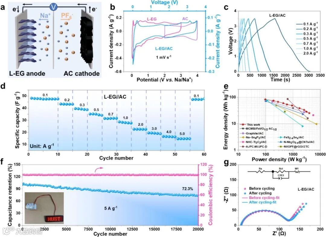 为证明L-EG潜在的商业应用价值,以L-EG为负极、活性炭为正极、1M NaPF6为电解液,组装成非对称混合型电容器。器件拥有3.5 V的宽电压,能量密度可达82.1 Wh kg−1,循环20000圈容量还能保持72.3%,展现出良好的电化学性能(图4)。
