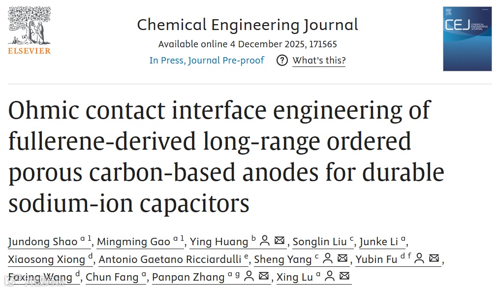 富勒烯衍生长程有序多孔碳的欧姆接触界面工程用于稳定的Na+混合型电容器