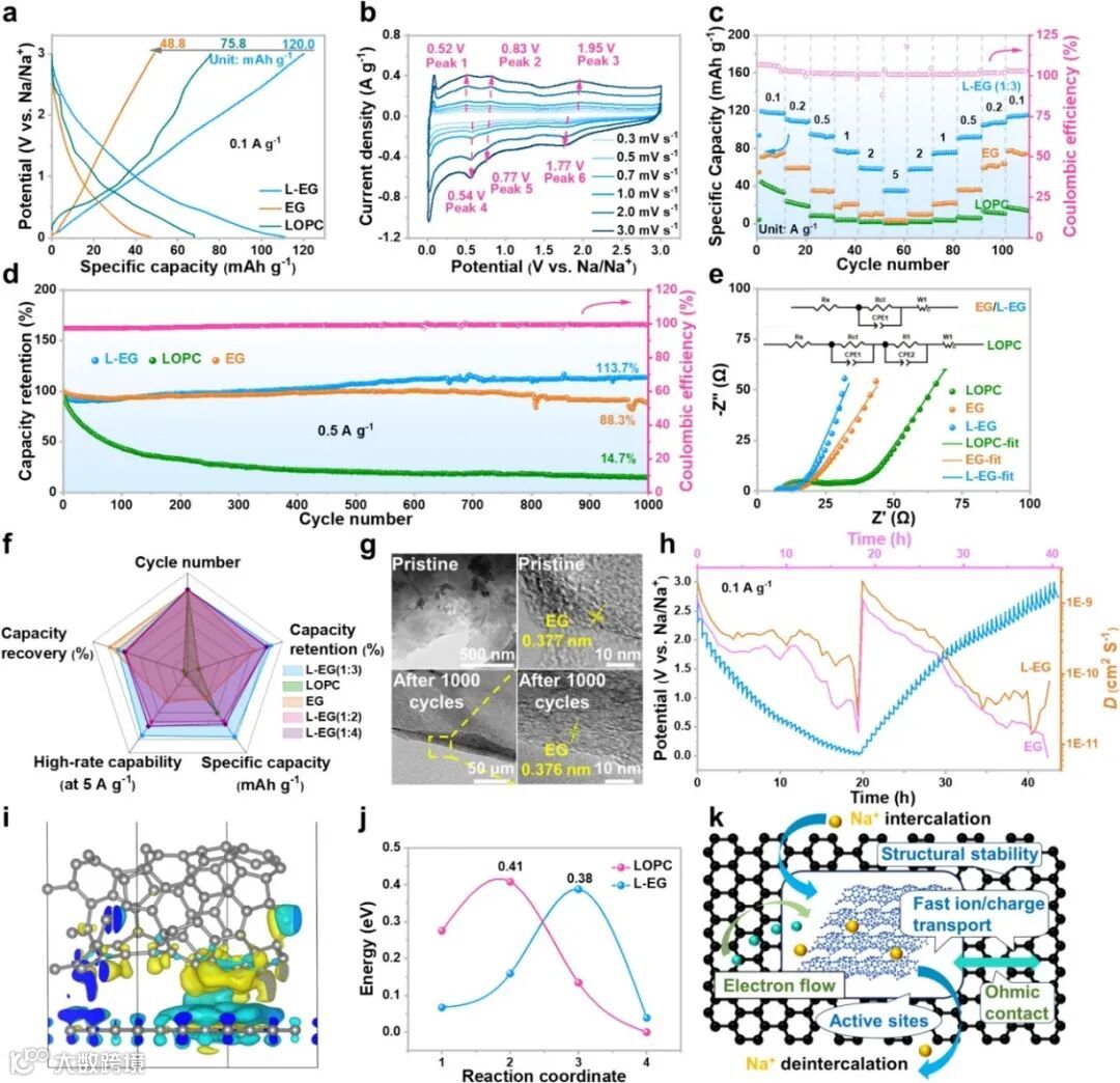 Fig. 3. Electrochemical behavior and charge storage mechanism of L-EG electrode. (a) GCD curves of L-EG (1:3), EG, and LOPC electrodes at 0.1 A g−1. (b) CV curves of the L-EG (1:3) electrode at 0.3–3.0 mV s−1. (c) Rate performance and (d) cycling performance of L-EG (1:3), LOPC, and EG electrodes at 0.5 A g−1. (e) Nyquist plots of EG, LOPC, and L-EG (1:3) electrodes before cycling test. Inset: fitted circuit diagrams. (f) Performance comparison between L-EG, LOPC, and EG electrodes. (g) Ex situ TEM and HRTEM images of L-EG electrodes before and after 1000 cycles. (h) GITT curves and ion diffusion coefficients of L-EG and EG electrodes at a current density of 0.1 A g−1. (i) The charge density of L-EG. (j) The migration energy barriers on the surface of L-EG and LOPC. (k) Schematic diagram of performance enhancement of L-EG.