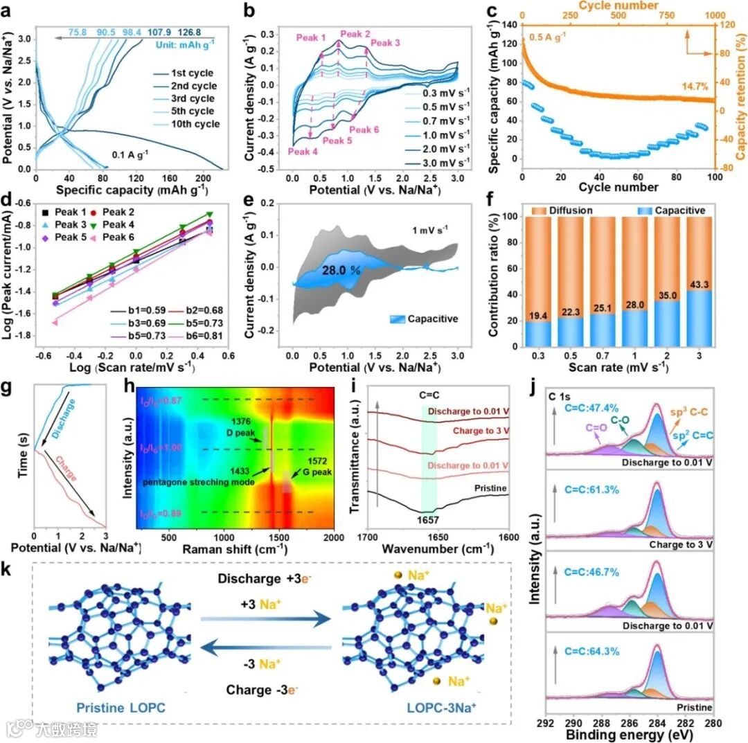 Fig. 2. Electrochemical behavior and charge storage mechanism of L-EG electrode. (a) GCD curves of the LOPC electrode at 0.1 A g−1 of the initial 10 cycles. (b) CV curves of the LOPC electrode at 0.3-3.0 mV s−1. (c) Rate performance and cycling performance of the LOPC electrode. (d) The linear fits of vs. plots for each redox peak in CV curves. (e) CV curve of the LOPC electrode with separation between the total (grey) current and the capacitive (blue) current at 1 mV s−1. (f) Normalized contribution ratios of the diffusion-controlled and capacitive currents as a function of scan rate. (g, h) GCD curve of the LOPC electrode at 0.5 A g−1 and the corresponding in situ Raman spectra of the LOPC electrode. (i) Ex situ FT-IR spectra and (j) Ex situ C 1 s XPS spectra of the LOPC electrode. (k) Schematic illustration of Na+ storage mechanism in LOPC during the charge/discharge process.
