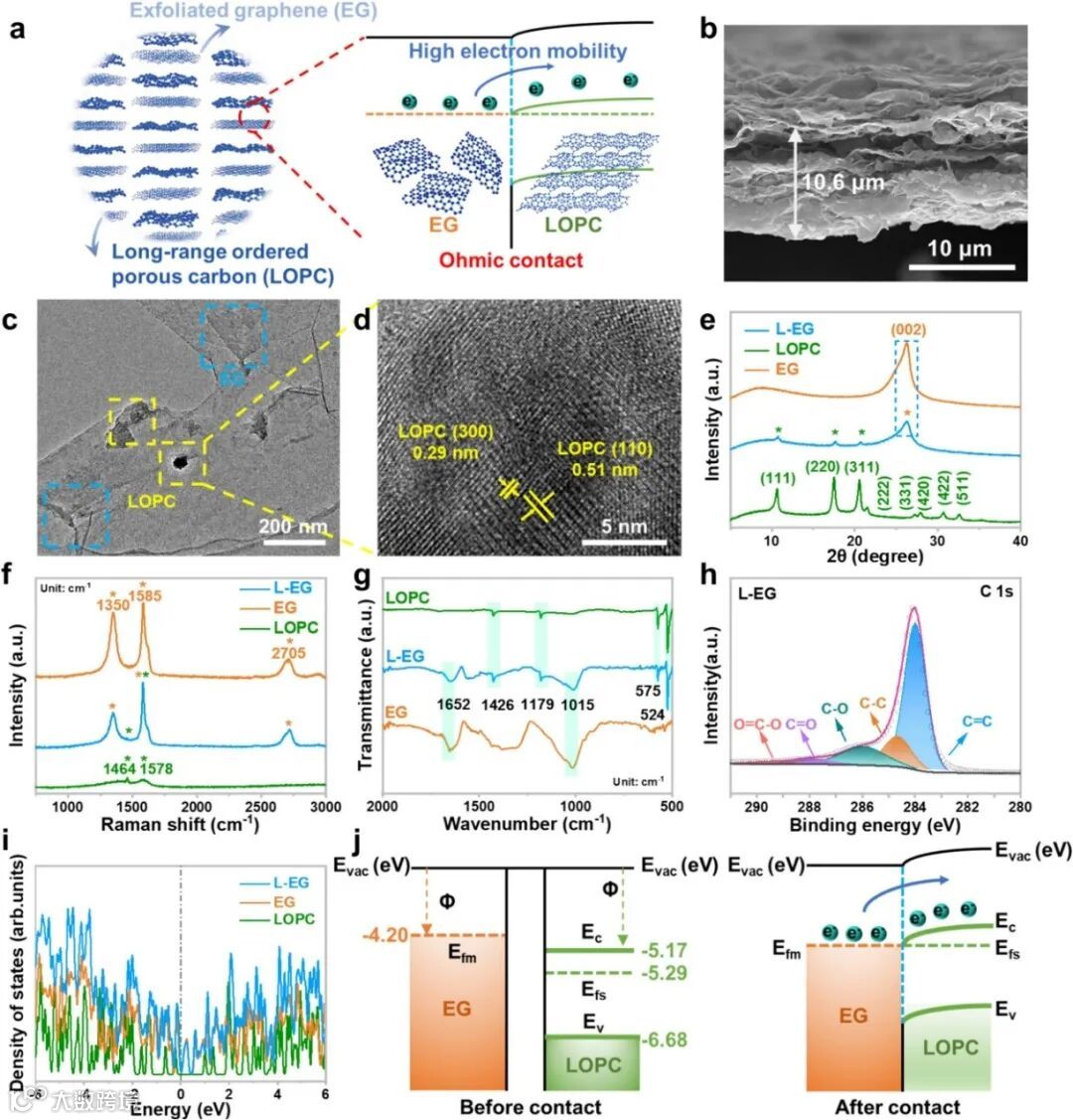 Fig. 1. Synthesis and characterizations of L-EG. (a) Schematic representation of the ohmic contact with the electron flow between LOPC and EG. (b) Side-view SEM images of the L-EG films. (c, d) TEM and HRTEM images of L-EG. (e) XRD patterns, (f) Raman spectra, and (g) FT-IR spectra of LOPC powder, EG film, and L-EG film. (h) C 1 s XPS spectrum of L-EG film. (i) Density of states of LOPC, EG, and L-EG. (j) Schematic diagram of band structures of L-EG before and after contact (Evac: vacuum energy level; Ec: conduction band; Ev: valence band; Efm: Fermi level of EG; Efs: Fermi level of LOPC).
