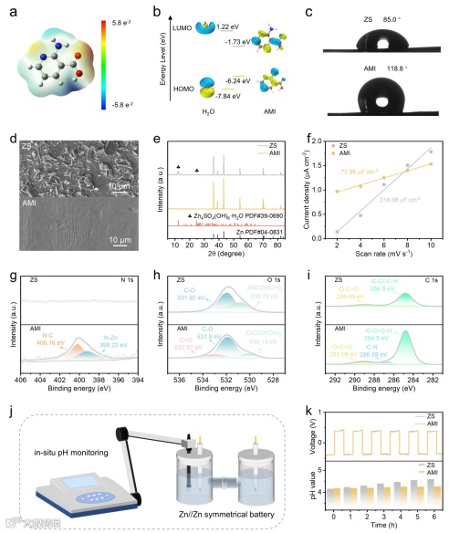 图3. (a) AMI分子的静电势图。(b) H₂O和AMI的HOMO与LUMO能级。(c) ZS和含AMI的ZS电解液在锌片上的接触角测量。(d) 锌片在不同电解质中浸泡10天后的SEM图像及 (e) 相应XRD图谱。(f) 不同电解液中Zn//Zn对称电池的EDLC。(g-i) 循环后的锌负极的N1s、O1s、C1s XPS谱。(j, k) ZS和含AMI的ZS电解液体系的原位pH监测。