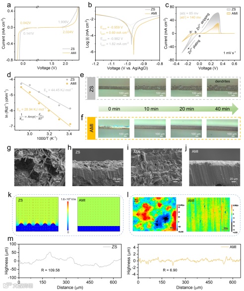 图4. (a) LSV,(b) Tafel曲线,以及 (c) ZS和含AMI的ZS电解液中Zn//Cu半电池的CV曲线。(d) ZS和含AMI的ZS电解质的Arrhenius曲线。(e, f) 不同时间下ZS和含AMI的ZS电解液的光学显微镜图像。ZS电解液 (g ,h) 和含AMI的ZS电解液 (i, j) 中,在5 mA cm−2和5 mAh cm−2条件下的锌负极循环后的俯视及侧视SEM图像。(k) 电场分布的COMSOL模拟。(l) 循环后的锌负极3D CLSM图像及 (m)相应的表面粗糙度曲线。