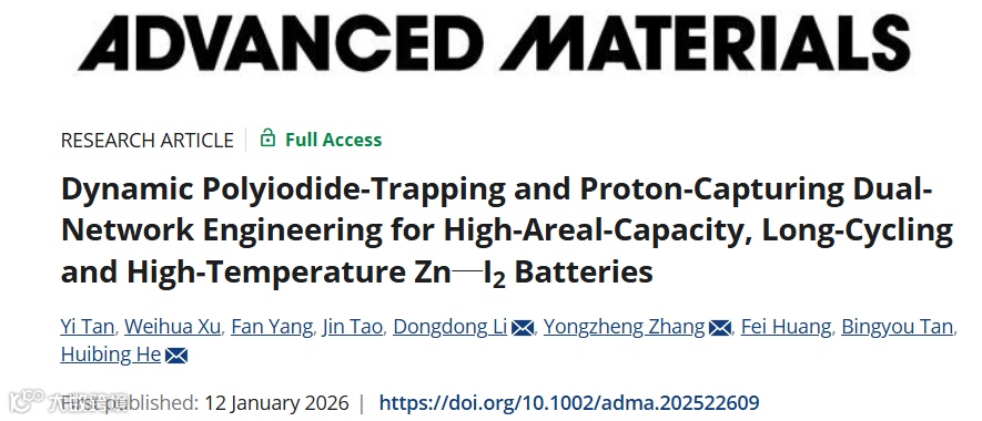 近日,来自广西大学何会兵/李冬冬&南通大学张永正研究团队在国际知名期刊Advanced Materials上发表题为" Dynamic Polyiodide-Trapping and Proton-Capturing Dual-Network Engineering for High-Areal-Capacity, Long-Cycling and High-Temperature Zn-I2 Batteries" 的研究性文章。该研究首次引入氨基烟酸(AMI)作为电解液添加剂,通过构建“动态多碘化物捕获-质子捕捉”双网络工程,显著提升了锌碘电池的面容量、循环稳定性与高温性能。