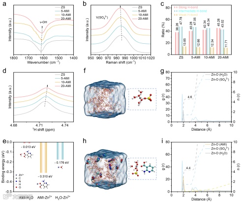 图2. (a) FT-IR光谱,(b) 拉曼光谱,(c) 不同氢键强度的百分比强度,以及 (d) ZS、5-AMI、10-AMI和20-AMI的¹H-NMR谱。(e) AMI与H₂O、Zn2+与AMI、Zn²⁺与H₂O之间的结合能。(f, h) ZS和含AMI体系的分子动力学MD模拟示意图。(g, i) ZS和含AMI电解质中Zn²⁺的模拟径向分布函数(RDFs)与配位数(CN)。