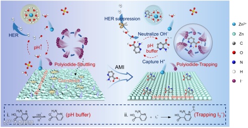实验与理论计算证实,AMI添加剂通过其分子中的吡啶氮等活性位点与聚碘化物(如I3−)发生离子-偶极相互作用,能自发、强效地将其捕获,显著抑制了聚碘化物的穿梭,从而有效缓解了其对锌负极的腐蚀,保障了电池的长循环稳定性。