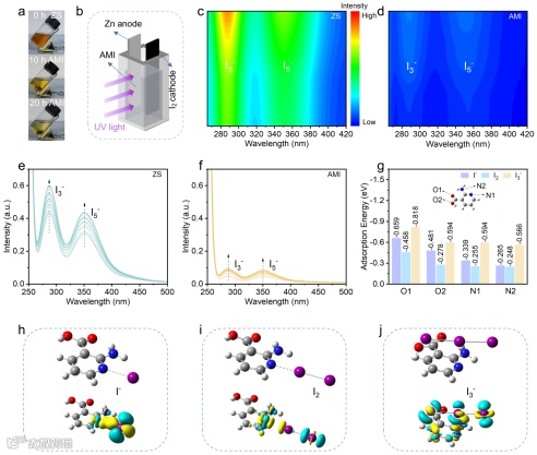 图7. (a) 加入AMI后I3−溶液的颜色变化。(b) 原位紫外可见装置中Zn–I2电池示意图。ZS (c, e) 和含AMI (d, f) 电解液的原位紫外可见吸收光谱。(g) 多碘化物与AMI中各官能团之间的吸附能。吡啶-N与I⁻ (h)、I2(i) 和I3− (j) 的构型及相应差分电荷密度图。