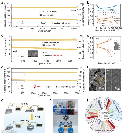 在Zn-I2全电池中,AMI添加剂表现出优异的实际应用性能。该电池在碘负载量为4.6 mg cm−2的条件下稳定循环超过30,000次,每圈容量衰减率仅为0.001%。即使在23.8 mg cm−2的超高碘负载量下,电池仍可实现3.1 mAh cm−2的面容量,并循环超过2,800次。在50 °C高温环境下循环3,000次后,容量保持率仍达84.6%。此外,软包电池在弯折、切割和刺穿后仍能正常工作,显示出良好的安全性和实用潜力。与近期报道的电解液工程研究相比,本工作实现了最高的碘正极面负载量和面容量,综合性能显著领先,表明其在大规模储能系统中具有广阔的应用前景。