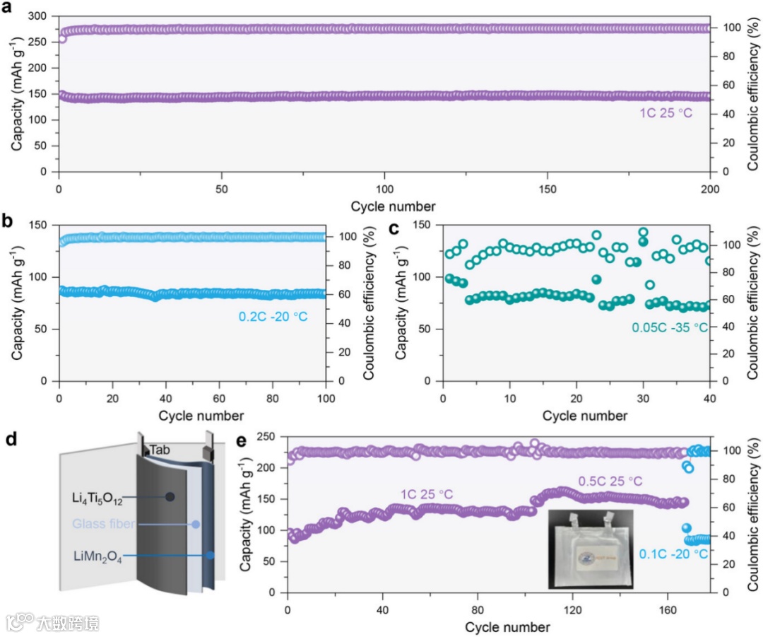 在常温条件下组装了所使用的正负极分别为 LiMn2O4 和 Li4Ti5O12,其质量负载分别为 23 和 11 mg cm−2米的软包电池以进一步评估这种电解质在实际应用中的可行性。(图 5d)。该软包电池在 0.5C 时可实现约 154 mAh g−1的可逆容量,在 1C 时为 134 mAh g−1(图 5),表现出稳定的循环性能。此外,在 -20°C 和 0.1C 条件下,该软包电池在如此高的电极负载下仍能实现约 86 mAh g−1的容量,这在该研究领域中很少有报道。这些结果进一步证明了 MSE 设计在各种挑战性条件和可扩展电池形式中的可靠性和实际适用性,为其在大规模储能中的潜力奠定了基础。