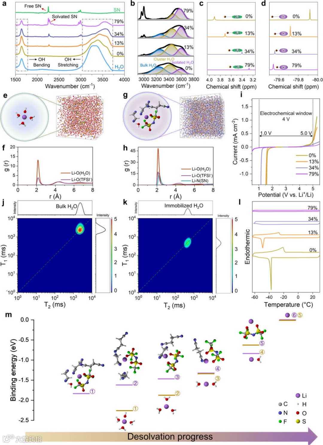 在强溶剂化溶剂(例如磷酸三甲酯(TMP)、二甲基乙酰胺(DMAc)中,负电荷主要集中在氧原子和氮原子上,相对于非配位溶剂(例如氢氟醚(HFE),其静电势(ESP)显著降低。强溶剂化溶剂、非配位溶剂以及一组中等溶剂化溶剂之间存在明显区别。这些中等溶剂的 ESPmin 值明显降低,局部负电荷密度更高,但其配位能力仍不如具有强溶剂化能力的溶剂显著。基于对关键溶剂描述符的综合评估,SN 成为一种极具潜力的中等极性溶剂。它满足了有效锂离子-阴离子结合以及简单脱溶的设计要求,这对于高压和低温水性电池来说是至关重要的。具体而言,SN 具有中等的给电子数(15 kcal mol⁻¹)、适度的 |ESPmin| 和适中的锂离子结合能,并且安全性高,使其非常适合用于先进的水系电解质配方(图2)。以丁二腈作为共溶剂的MSE为模型体系,其能与Li⁺进行中等强度的配位,从而重塑溶剂化结构,形成Li⁺-阴离子-水三元复合溶剂化壳层,具有低脱溶剂化能垒(图3)。