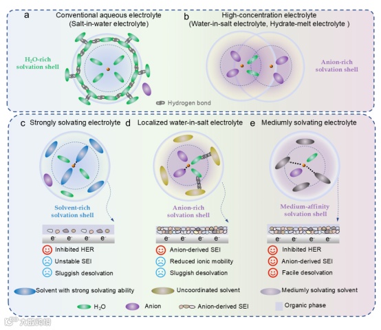 水系电池因其成本效益高和环境可持续性强而受到越来越多的关注。此外,水系电解液本身具有不可燃性、高离子电导率以及简便的制备工艺,无需复杂设备即可实现。这些优势使水系电池成为下一代能源储存技术,特别是在电网规模整合间歇性可再生能源方面的有力竞争者。然而,受限于当前电解液体系的性能不足,水系电池仍面临放电电压平台低(≤2 V)。此外,电极-电解液界面不稳定也会导致电化学性能迅速衰退。高浓度的盐包水电解液和水合熔融盐电解液可以一定程度的延缓电池恶化。然而,这些电解质中所需的高盐浓度会导致粘度增加,离子电导率降低,并且在低温下盐结晶的风险增加,最终限制了它们的实际适用性。为应对这些挑战,共溶剂工程作为一种经济有效的策略应运而生,能够调整溶剂化结构,从而扩大有效溶剂化半径。如图 1c 所示,高极性溶剂通常对 Li⁺ 具有更强的溶剂化能力,能够取代主溶剂化鞘中的阴离子,从而促进传统混合水系电解质中溶剂参与的 SSIP 结构的形成。锂离子与共溶剂之间的强配位作用导致较高的脱溶活化能,从而延缓在外亥姆霍兹面发生的脱溶过程。虽然阳离子与阴离子之间的弱静电相互作用有利于快速离子传输,但共溶剂在内亥姆霍兹的分解可能会在 SEI 中引入不良的非 Li⁺ 导电物质,这些物质在长期循环中会降解,从而限制了长期存储的循环稳定性。 作为替代方案,使用惰性溶剂能够形成局部类似盐中水的溶剂化结构这可能促进阴离子衍生的 SEI 形成(图 1d)这种方法与非水溶液局部高浓度电解质的原理类似,即通过非溶剂化稀释剂来设计局部溶剂化环境,从而提高界面稳定性。然而,此类体系在水性电解质中往往存在明显的离子配对和阴离子聚集现象,导致水动力学半径增大、离子迁移率降低以及去溶剂化动力学受阻。这些限制共同削弱了电池的倍率性能和低温工作能力。因此,开发既能促进快速 Li⁺ 去溶剂化又能有效抑制析氢反应的先进水性电解质,对于实现高压、低温水性电池的实际应用至关重要。