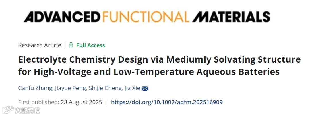 近日,来自华中科技大学的谢佳教在国际知名期刊Advanced Functional Materials、上发表题为“Electrolyte Chemistry Design via Mediumly Solvating Structure for High-Voltage and Low-Temperature Aqueous Batteries”的研究论文。结合概念建模与实验设计方法,提出了一种可精确调控离子溶剂化行为的中等溶剂化电解液(MSE, mediumly solvating electrolytes)策略。