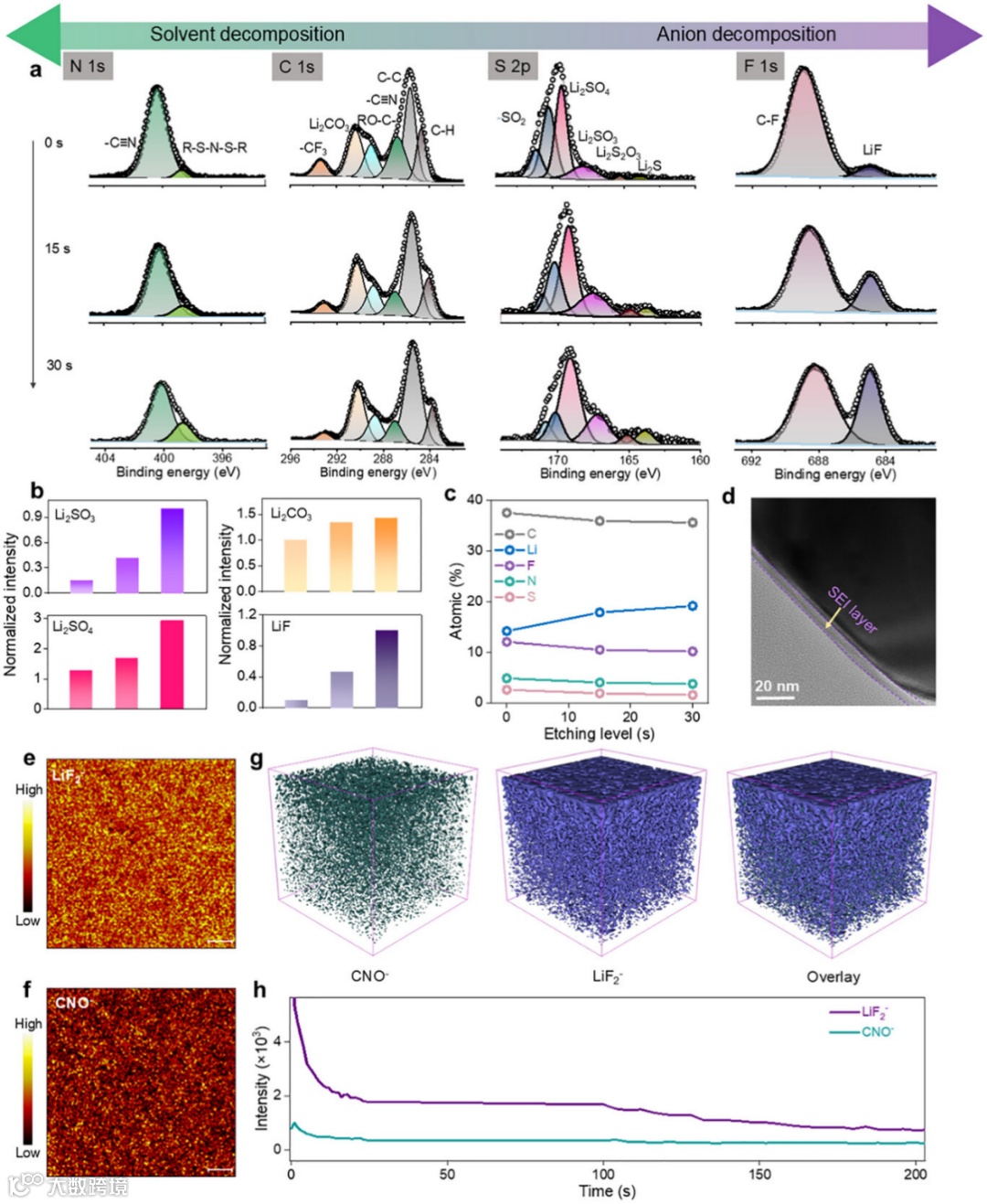 4.紧密的离子对结构可优先诱导阴离子还原,形成稳定的富阴离子SEI膜,在实现界面稳定性的同时,也促进Li⁺在梯度SEI层中的快速迁移。