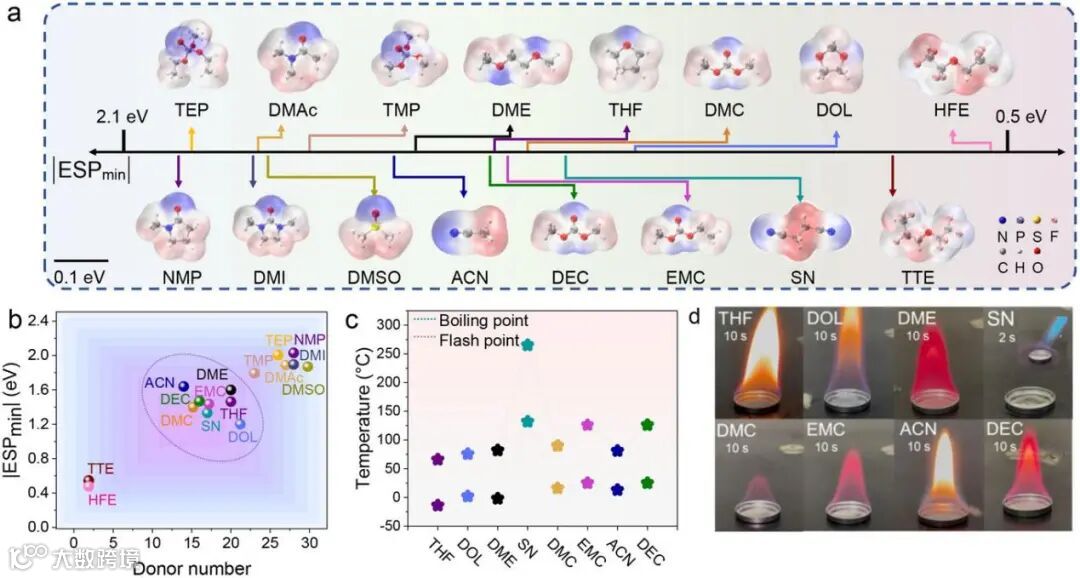 2.选用具有适中最小静电势(|ESPmin|)与合理供电子能力(DN值)的溶剂,实现中等强度的Li⁺配位能力,从而兼顾高离子电导率与快速离子传输;