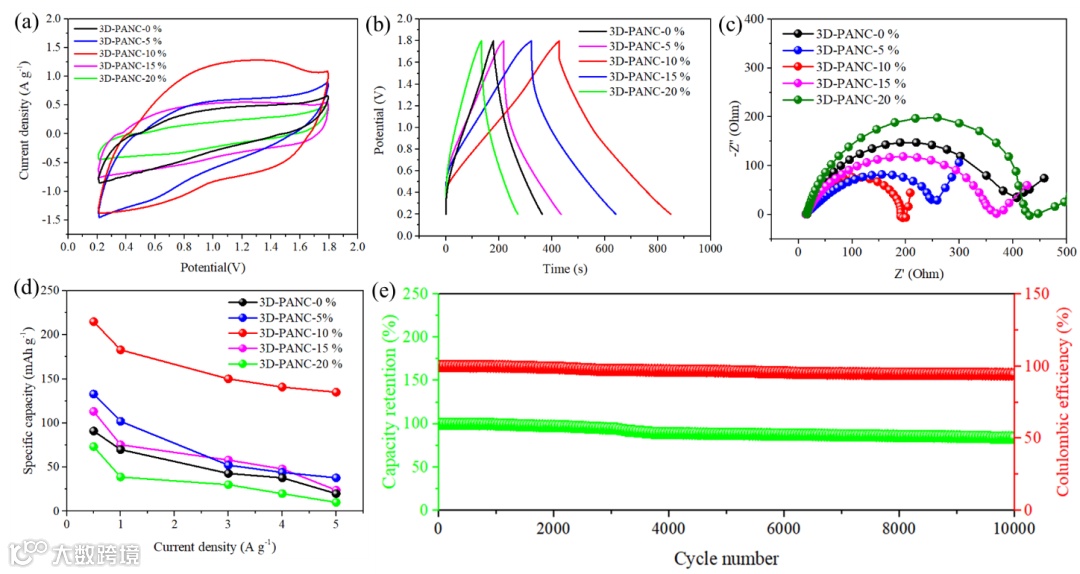 通过调控氯化锌的添加量,可有效调节碳纤维的交联程度与孔结构,从而协同提升碳纤维的孔隙率与导电性。其中,优化后的碳纤维(3D-PANC-10%)展现出高导电性、大比表面积(564.33 m² g⁻¹)以及包含丰富微孔与中孔的分级多孔结构。基于3D-PANC-10%作为阴极的锌离子混合超级电容器表现出优异的电化学性能:高比容量(215 mAh g⁻¹,折合483.8 F g⁻¹)、良好的循环稳定性(在0.5 A g⁻¹电流密度下循环10,000次后容量保持率达84.2%),以及出色的倍率性能(电流密度从0.5 A g⁻¹增至5 A g⁻¹时容量保持率为62.7%)。