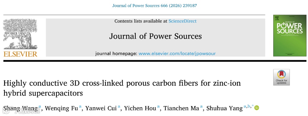 Shang Wang, Wenqing Fu, Yanwei Cui, Yichen Hou, Tianchen Ma, Shuhua Yang, Highly conductive 3d cross-linked porous carbon fibers for zinc-ion hybrid supercapacitors. J. Power Sources, 2026, 666: 239187.