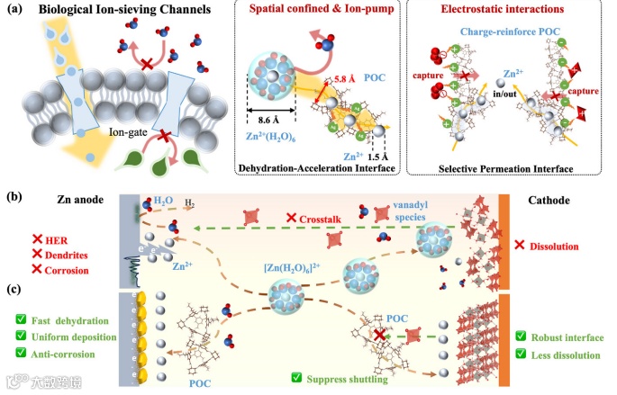 图.a)生物膜的离子选择性渗透机制及实现高效离子筛分的仿生POC通道。b)溶剂化Zn²⁺离子引发负极部分的析氢反应、枝晶生长以及RAZB中的正极溶解。c)RAZB中的双界面离子调控:Zn箔上空间限域、受离子泵启发的POC层用于调控离子通量,而电荷增强的具有可调价态的POCs用于稳定正极界面。