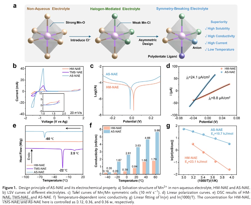 近日,来自中科院宁波材料所的王刚团队,在国际知名期刊Advanced Functional Materials上发表题为“Asymmetric Mn2+ cluster electrolyte for high-performance Mn-metal batteries”的研究论文。该论文介绍了一种用于高性能锰金属电池的非对称Mn2+团簇电解质。Mn2+团簇的非对称溶剂化结构大大提高了电解质的浓度、离子电导率(3.63-4.68 mS/cm)和极限电流(>8 mA/cm2)。