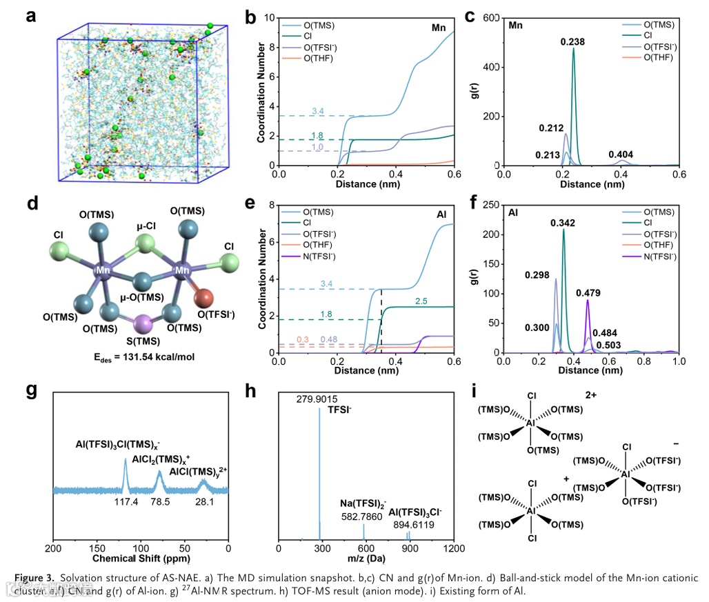 作者使用分子动力学模拟来研究Mn2+的溶剂化结构。结果表明,每个Mn2+平均与3.4个O(TMS),1.8个Cl−和1个O(TFSI−)结合;THF未参与溶剂化,仅作为稀释剂存在。两个Mn2+通过共用一个Cl−形成桥键连接,构成Cl-Mn-Cl的链状核心,打破了HM-NAE中的笼式结构,解离能为131.5 kcal/mol (全分解路径),低于HM-NAE的133 kcal/mol (半分解路径)。簇离子配位对称性低,有效提高了其溶解度。此外,Al以AlCl2+,AlCl2+和Al(TFSI)3Cl−的形式存在,使构建混合型锰金属器件成为可能。