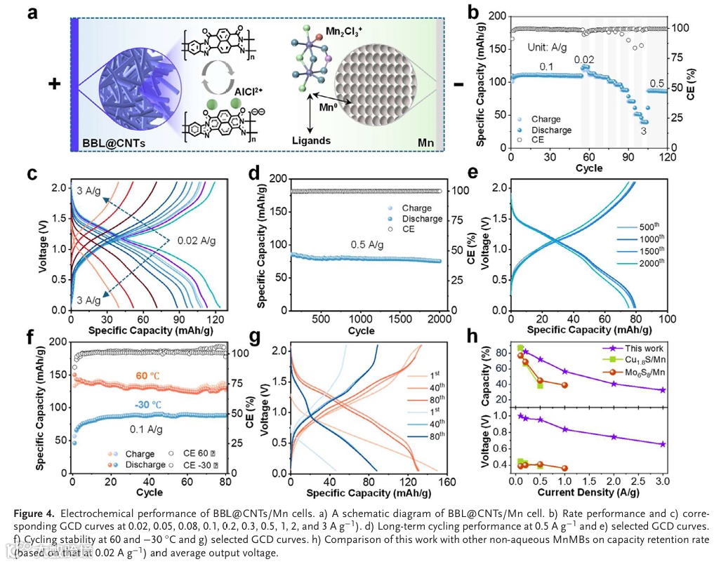 为了验证AS-NAE在全电池中的实用性,作者选择梯形聚合物BBL作为正极材料(BBL@CNTs电极)与Mn金属负极配对。选择BBL的原因在于,其含有丰富的氧化还原活性位点、良好的导电性和出色的稳定性。在0.1 A/g的GCD测试中,BBL@CNTs /Mn电池在50次循环中表现出~109 mAh/g的高比容量,无容量衰减。GCD和dQ/dV曲线存在三个还原峰(0.72V,1.09V和1.39V)和两个氧化峰(1.24V和1.72V)。BBL@CNTs/Mn电池平均输出电压达1V,这远高于Mo6S8/Mn和Cu1.8S/Mn电池的0.45-0.55 V。0.5 A/g长循环2000次后,比容量从86.2 mAh/g缓慢衰减到75.3 mAh/g。同时,BBL@CNTs/Mn电池还展示出良好的高低温性能。