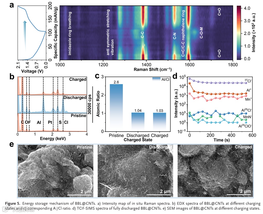 储能机理方面,原位拉曼光谱和红外光谱的结果表明BBL发生了羰基和亚胺基的可逆氧化还原反应,EDS、TOF-SIMS结果表明正极侧载流子为AlCl2+;BBL在反应期间没有发生显著的体积变化。