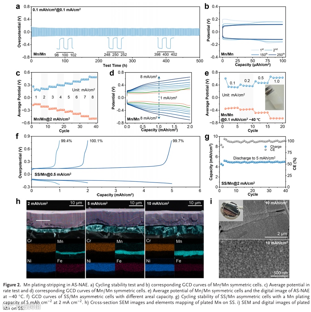 为了评估AS-NAE中的Mn沉积-剥离行为,作者分别在Mn/Mn对称和SS/Mn非对称电池中进行循环稳定性测试。Mn/Mn电池在超过500h的恒电流测试期间保持稳定,未观察到短路和极化增加。Mn/Mn电池在1-8 mA/cm2还表现出优异的倍率性能(面容量为2 mAh/cm2)。在1 mA/cm2下,过电势仅为127 mV;在8 mA/cm2时过电势增加至472 mV。即使在−40 ℃下,Mn/Mn电池也能进行良好的沉积-剥离。SS/Mn不对称电池在不同面容量(1-5 mAh/cm2)的测试和高面容量循环测试(1-5 mAh/cm2)中均展现出优异的稳定性。
