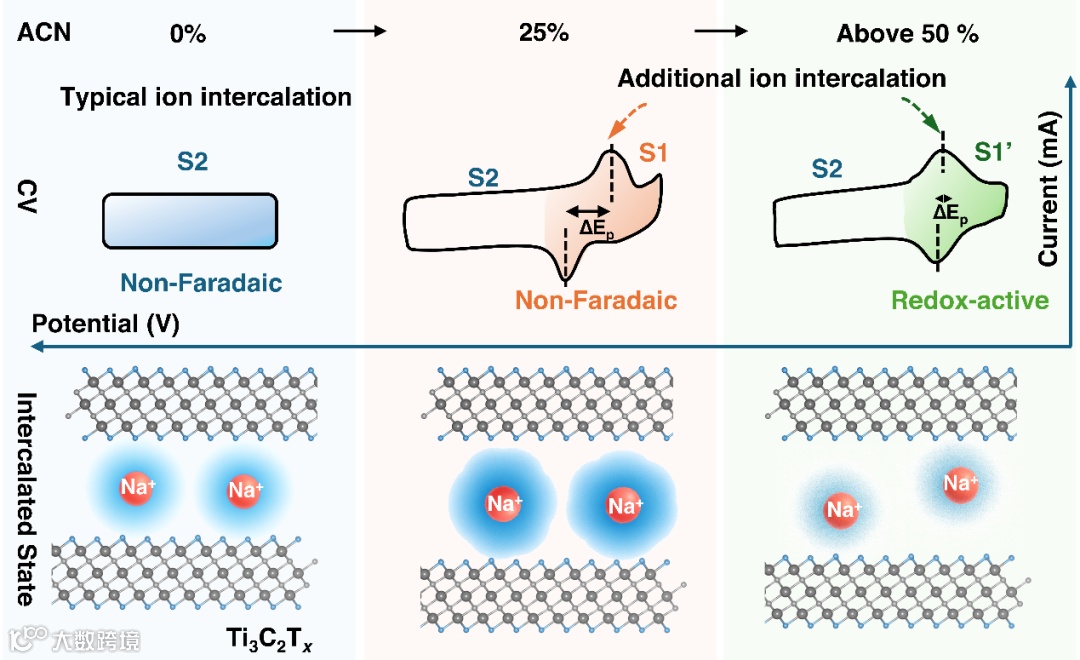 图1. Ti3C2Tx MXene 在不同乙腈(ACN)含量的 2 M NaClO4水系电解液中的循环伏安(CV)曲线及其对应的离子插入和电荷存储机制。