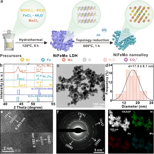 图 1. NiFeMo纳米合金催化剂合成路线示意图及基本结构、形貌、成分表征。