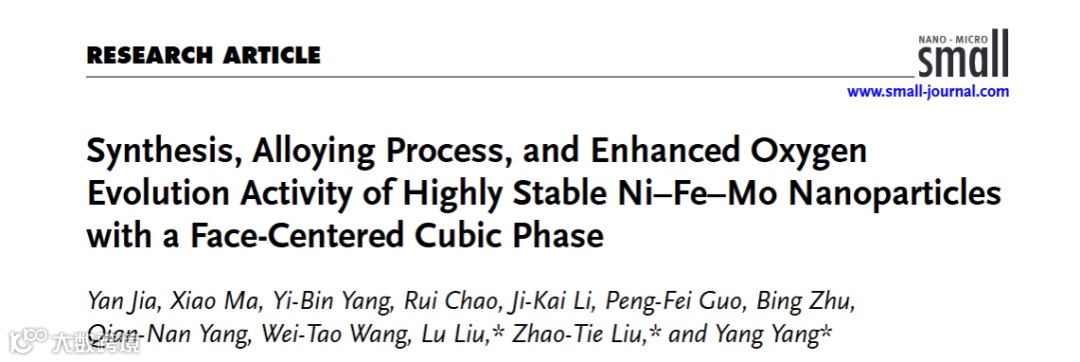 近日,陕西科技大学杨阳老师在国际知名期刊Small上发表题为“Synthesis, Alloying Process,and Enhanced Oxygen Evolution Activity of Highly Stable Ni-Fe-Mo Nanoparticles with a Face-Centered Cubic Phase”的研究论文。该研究报道了一种通过原位热还原调控层状前驱体获得的高稳定性 fcc-NiFeMo 合金纳米催化剂。研究团队以 NiFeMo 层状双氢氧化物(LDH)为前驱体,通过600 ℃下的氢气还原过程实现了从 LDH → Ni1-xMoxFe2O4→ fcc-NiFeMo 合金的相转变。该方法在非平衡条件下稳定了高含 Mo 的面心立方结构,为过渡金属多元合金的构筑提供了新的途径。