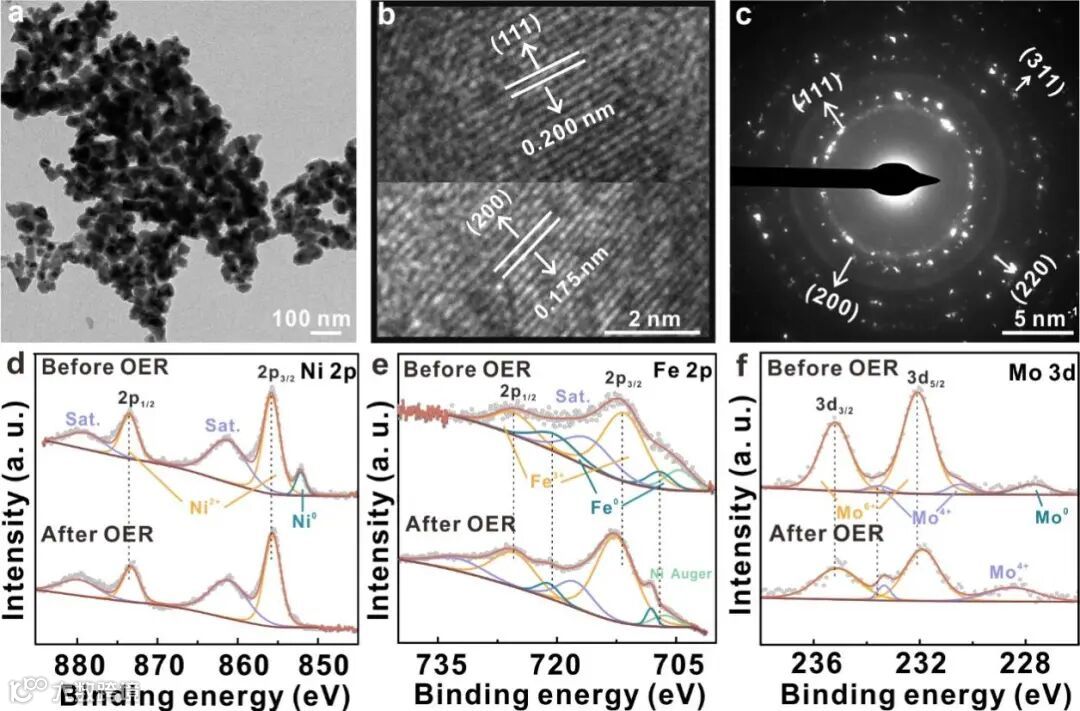 图 6. NiFeMo 纳米合金催化剂在OER反应后的结构变化。