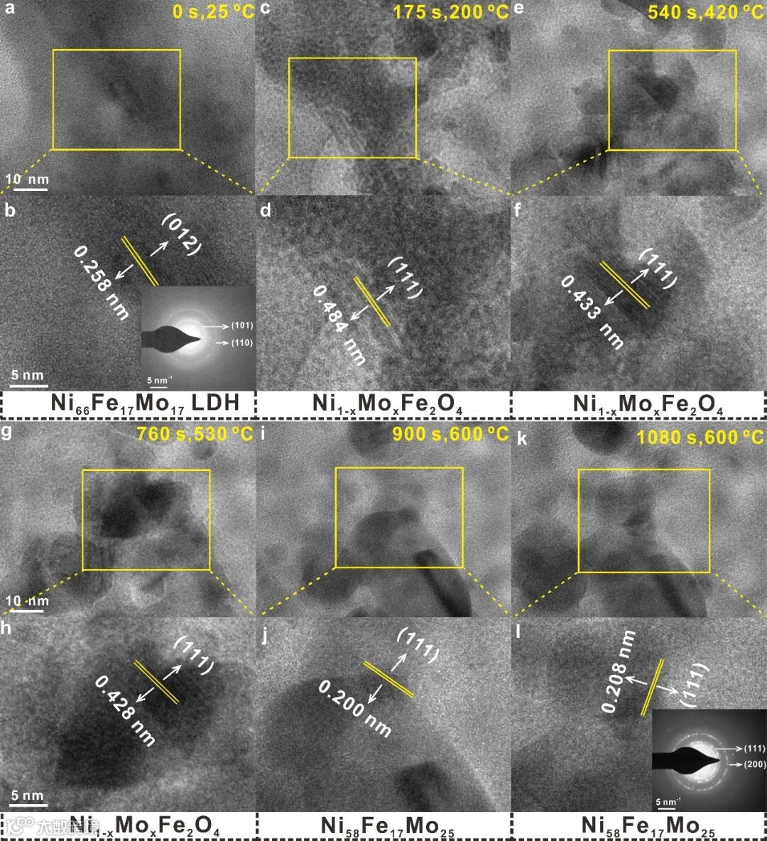 研究团队通过原位加热透射电镜(in situ TEM)观察到,NiFeMo-LDH 前驱体在升温过程中依次经历了 LDH 相 → Ni1-xMoxFe2O4自旋相 → fcc-NiFeMo 合金相的转变过程。该热诱导合金化路径不仅实现了原子级混合的三元固溶结构,也使得高 Mo 含量体系在非平衡条件下保持了面心立方相稳定性。XRD、EXAFS 和 HAADF-STEM 等表征均证实了 Ni、Fe、Mo 原子均匀分布、无明显相分离,为后续的电化学稳定性提供了结构基础。