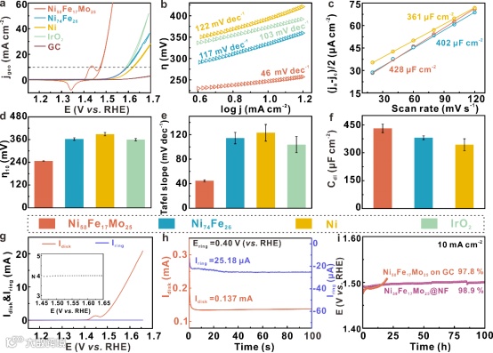 优化配比的 Ni58Fe17Mo25 合金在 1 M KOH 电解液中表现出卓越的 OER 性能,仅需 239 mV 的过电位即可达到 10 mA cm-2,Tafel 斜率低至 46 mV dec-1,远优于 NiFe 或 Ni 单金属体系。同时,其法拉第效率高达 99.3%,在 100 mA cm-2 连续工作 100 小时后性能几乎无衰减。该结果充分证明,Mo 掺杂不仅能提升反应动力学,还能有效抑制表面氧化物层的过度重构,保证长期稳定运行。