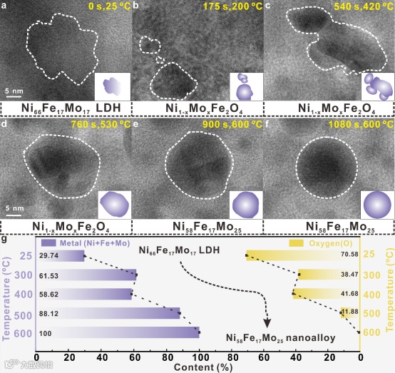 图 3. 原位TEM检测 NiFeMo 纳米合金的形态转变和成分变化。