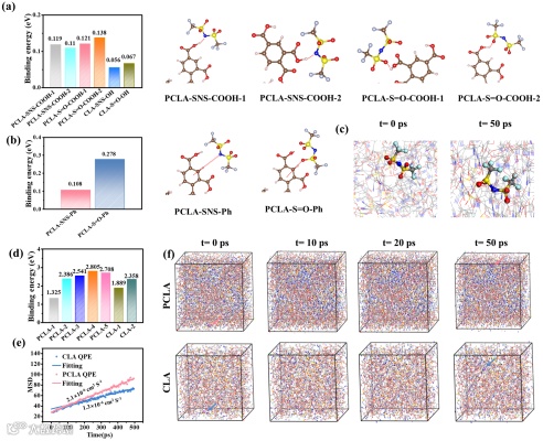 图3. PCLA QPE中锂离子传输机理。(a)氢键强度比较,重点C=O和O-H相互作用;(b)TFSI⁻阴离子与苯环(Ph)相互作用强度;(c)0和50皮秒时离子传输的分子动力学模拟;(d)氧亲和位点对锂离子结合能比较;(e)锂离子扩散系数对比;(f)分子动力学模拟。