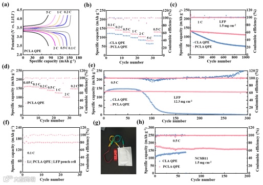 图5. Li | LFP 电池在25 °C下电化学性能测试。(a)电池在不同倍率(0.1 C至5 C)的充放电曲线;(b)从0.1 C到5 C的倍率性能;(c)1 C下的循环稳定性;(d)0.05-2 C 的倍率性能;(e)0.5 C下的循环稳定性;(f)软包电池在0.1 C下的长期循环性能;(g)软包电池点亮LED指示灯;(h)电池在0.5 C下的循环稳定性。