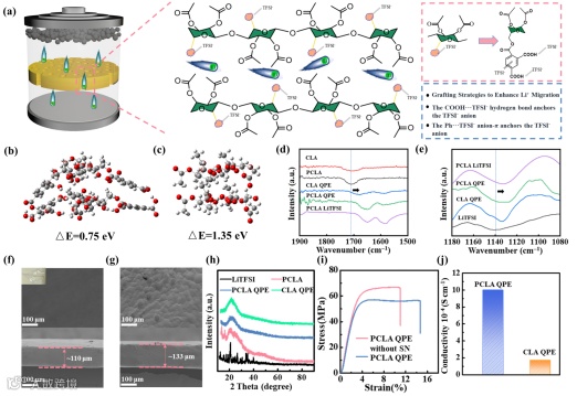 图1. PCLA QPE准固态电解质中锂离子迁移机理。(a)锂离子迁移示意图,展示三种不同机制;(b, c)PCLA和CLA的吸附能示意图,红、灰和白色分别表示氧、碳和氢原子;(d, e)FT-IR光谱;(f, g)SEM图,插图为柔性固态电解质折叠成纸飞机状;(h)XRD图谱;(i)添加与未添加丁二腈(SN)的PCLA QPE拉伸应力-应变曲线;(j)离子电导率对比。