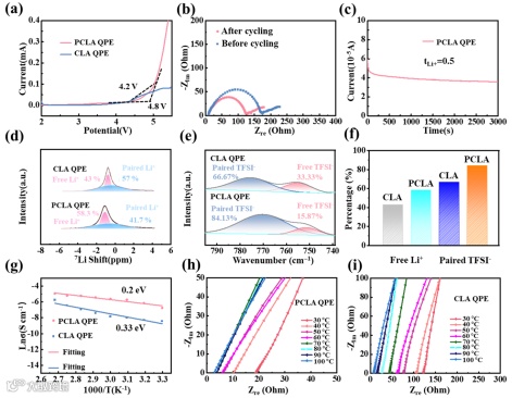 图2. PCLA QPE电解质中锂离子传输性能的分析。(a)线性扫描伏安曲线;(b, c)Li | PCLA QPE | Li 对称电池极化曲线;(d)魔角旋转核磁共振谱;(e)FT-IR光谱曲线;(f)自由锂离子与配对TFSI⁻的比较;(g)阿伦尼乌斯曲线;(h, i)不同温度下电化学阻抗谱。