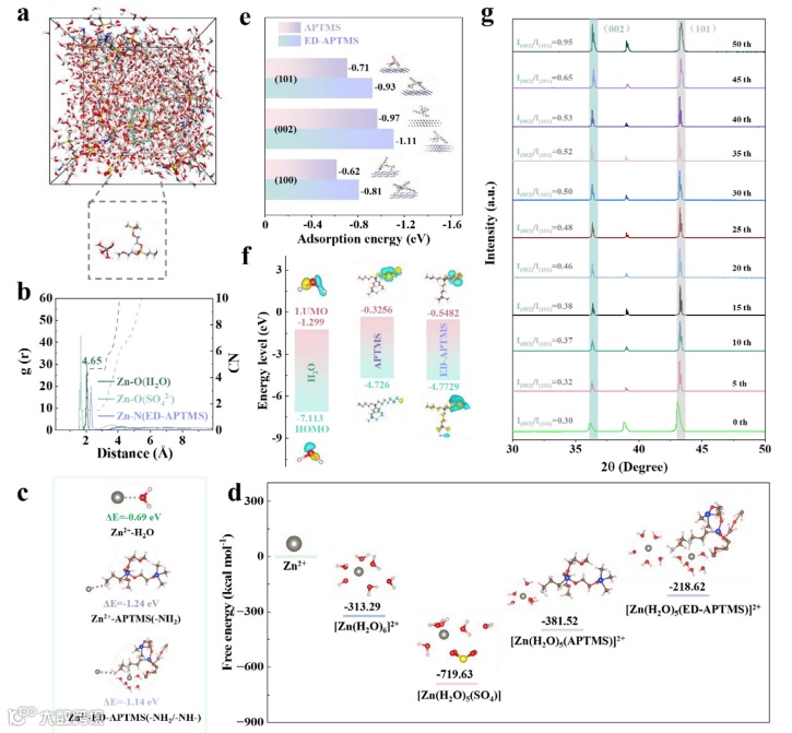 图3:硅烷基材料的静电相互作用与溶剂化调控。(a)ED-APTMS/ZS中Zn2+溶剂化的MD快照;(b)径向分布函数(RDF)与配位数(ACN)分析;(c)Zn2+与H2O、APTMS及ED-APTMS中─NH─/─NH2基团的配位键能;(d)[Zn(H2O)6]2+、[Zn(H2O)5(SO4)]、[Zn(H2O)5(APTMS)]2+、[Zn(H2O)5(ED-APTMS)]2+形成的自由能变化;(e)APTMS与ED-APTMS在Zn(002)、(100)、(101)晶面的吸附构型与吸附能;(f)H2O、APTMS、ED-APTMS的LUMO与HOMO能级;(g)Zn-P负极在不同沉积周期(0–50次)的离线XRD谱图(2θ 30-50°)。