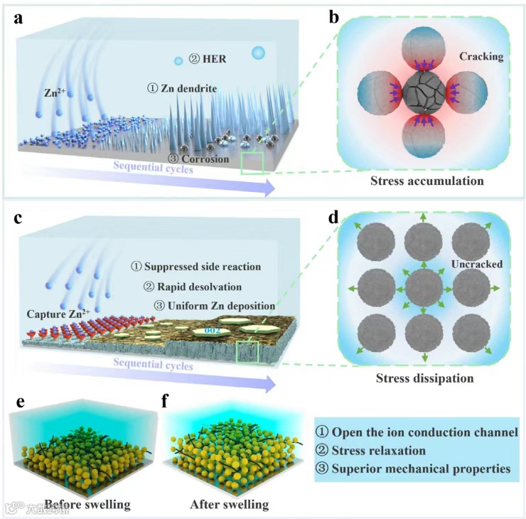 要点2:多维度表征揭示“溶胀驱动的应力消散、离子通道扩展”机制