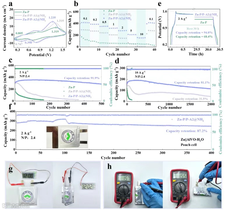 图6:Zn||AlVO-H2O全电池的电化学性能及实用化评估。(a)Zn-P、Zn-P/P-A1@NH2、Zn-P/P-A2@NH2基全电池CV曲线;(b)Zn-P、Zn-P/P-A1@NH2、Zn-P/P-A2@NH2负极Zn||AlVO-H2O全电池倍率性能;(c)2 A g-1、N/P比2.4下的循环性能;(d)Zn-P/P-A2@NH2||AlVO-H2O全电池10 A g-1高倍率循环性能与库仑效率;(e)静置30 h后Zn-P||AlVO-H2O与Zn-P/P-A2@NH2||AlVO-H2O全电池自放电行为;(f)Zn-P/P-A2@NH2负极软包电池(Zn||AlVO-H2O)2 A g-1循环性能及光学照片;(g)Zn-P/P-A2@NH2负极柔性软包电池在平展与弯折状态下驱动LCD屏的照片;(h)对应软包电池在形变下的电压输出,凸显机械鲁棒性。