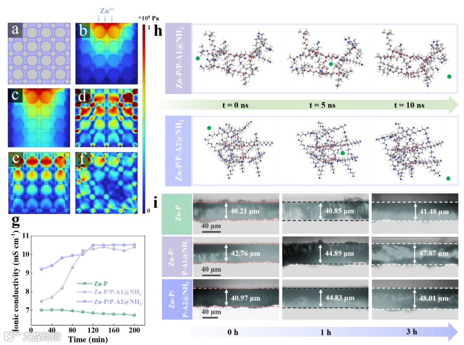 图2:溶胀诱导梯度结构用于应力调控与Zn2+传输。(a)不同锌粉负极的统一力学建模;(b、c)Zn2+自上而下渗透过程中锌粉负极内部初始应力态与过渡态;(d–f)完全扩散后Zn-P、Zn-P/P-A1@NH2、Zn-P/P-A2@NH2的应力演化;(g)溶胀扩散过程中不同Zn-P基负极的离子电导率随时间变化;(h)P-A1@NH2与P-A2@NH2中Zn2+传输的MD模拟;(i)电极在ZS中浸泡0、1、3 h后的截面光学照片。