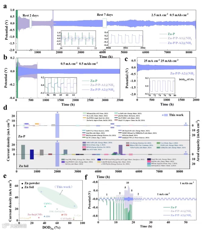 图5:原始与修饰Zn-P基Zn||Zn对称电池的电化学稳定性及长循环性能。(a)Zn-P、Zn-P/P-A1@NH2、Zn-P/P-A2@NH2负极组装的Zn||Zn对称电池在2.5 mA cm-2/0.5 mAh cm-2的长循环性能,含2天与7天两次静置;(b)三者在0.5 mA cm-2/0.5 mAh cm-2下的长循环性能;(c)Zn-P/P-A2@NH2电极在25 mA cm-2/25 mAh cm-2下的循环性能;(d)Zn-P/P-A2@NH2负极的电流密度与循环性能与文献对比;(e)Zn-P/P-A2@NH2负极的电流密度与Zn放电深度(DODZn)与文献对比;(f)原始与聚合物修饰Zn-P负极的倍率性能。