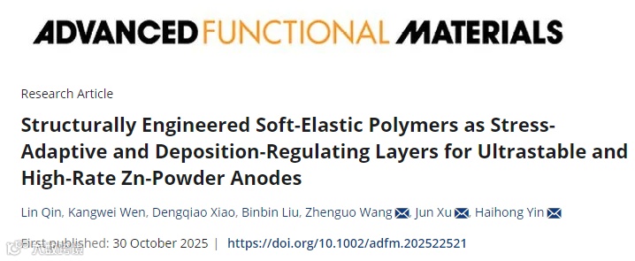 论文以“Structurally Engineered Soft-Elastic Polymers as Stress-Adaptive and Deposition-Regulating Layers for Ultrastable and High-Rate Zn-Powder Anodes”为题发表在国际权威期刊《Advanced Functional Materials》(DOI:10.1002/adfm.202522521),秦琳、研究生文康伟为共同第一作者。