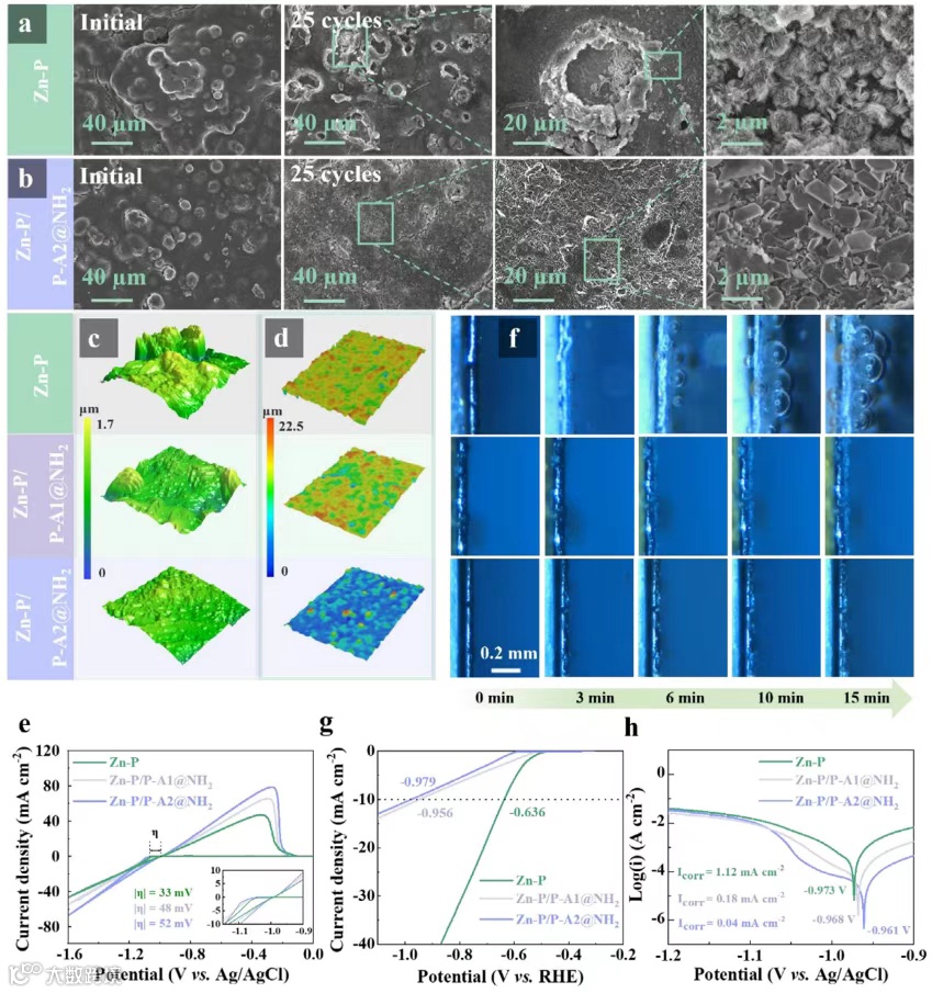 图4:原始与软弹性聚合物修饰Zn-P负极的表面形貌及电化学行为。(a、b)循环25次后Zn-P与Zn-P/P-A2@NH2对称电池的SEM图;(c、d)循环25次后Zn-P、Zn-P/P-A1@NH2、Zn-P/P-A2@NH2对称电池的AFM图及CLSM高度分布图;(e)Zn-P、Zn-P/P-A1@NH2、Zn-P/P-A2@NH2对称电池Zn沉积过程的原位光学显微图;(f)Zn-P||Ti、Zn-P/P-A1@NH2||Ti、Zn-P/P-A2@NH2||Ti半电池在5 mV s-1下的CV曲线;(g、h)原始与修饰Zn-P负极的LSV及Tafel曲线。