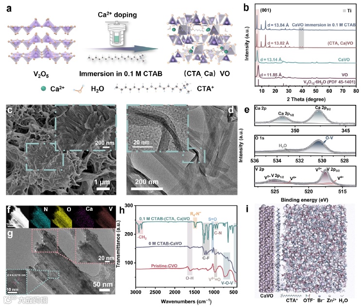 CTA⁺通过静电作用插入V–O层间,形成(CTA, Ca)VO正极,层间距从13.14 Å扩大至13.82 Å,增强了离子传输通道。此外,CTA⁺在电极表面形成双电层,提升界面电荷转移能力,随着电压扫描速率提升,赝电容贡献从79.6%提升至93.6%。