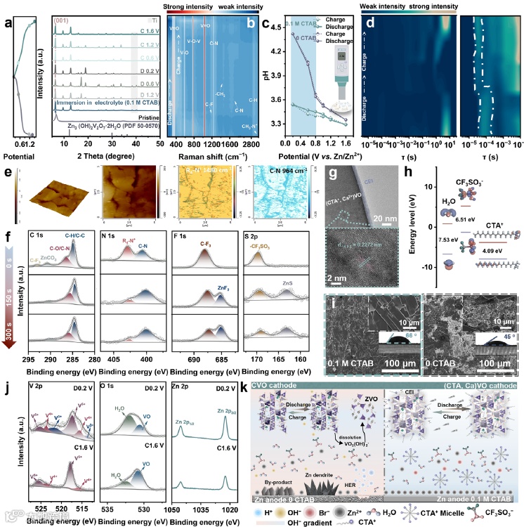 CTA⁺在循环过程中发生电化学分解,参与形成富含ZnF₂、ZnS、ZnCO₃等组分的有机-无机复合SEI/CEI层,有效保护锌负极与钒基正极界面,抑制副反应与结构退化。
